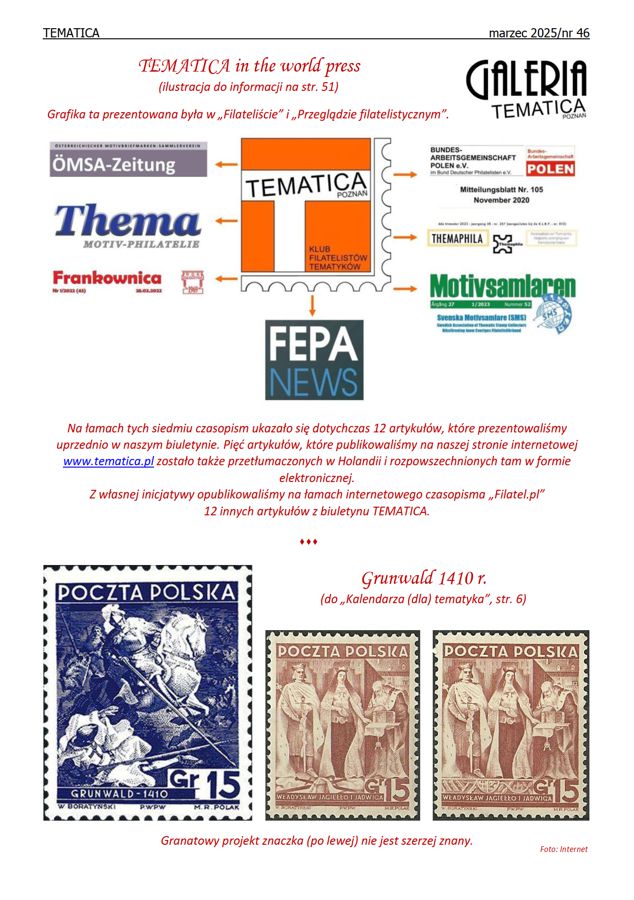 Pierwszy w tym roku, a 46 w kolejności biuletyn klubu TEMATICA jest gotowy. Oprócz kontynuacji kilku cykli tematycznych, znajdziecie w nim nowe i czasem mało znane informacje. Niewielu z nas słyszało i widziało tzw. kamienie pamięci, których są tysiące w Europie, a kilka mamy już w naszym kraju. Dwa zupełnie odmienne opracowania zajmują się kopertami Mulready’ego. Filatelistyczne uhonorowanie osiągnięć niektórych polskich olimpijczyków zainteresuje z pewnością także wielu z nas.