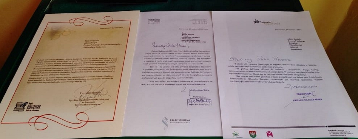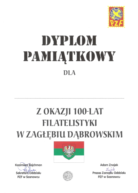 Polski Związek Filatelistów Oddział Sosnowiec dziękuje wszystkim instytucjom i osobom za pomoc w zorganizowaniu tego setnego jubileuszu filatelistyki w Zagłębiu Dąbrowskim.