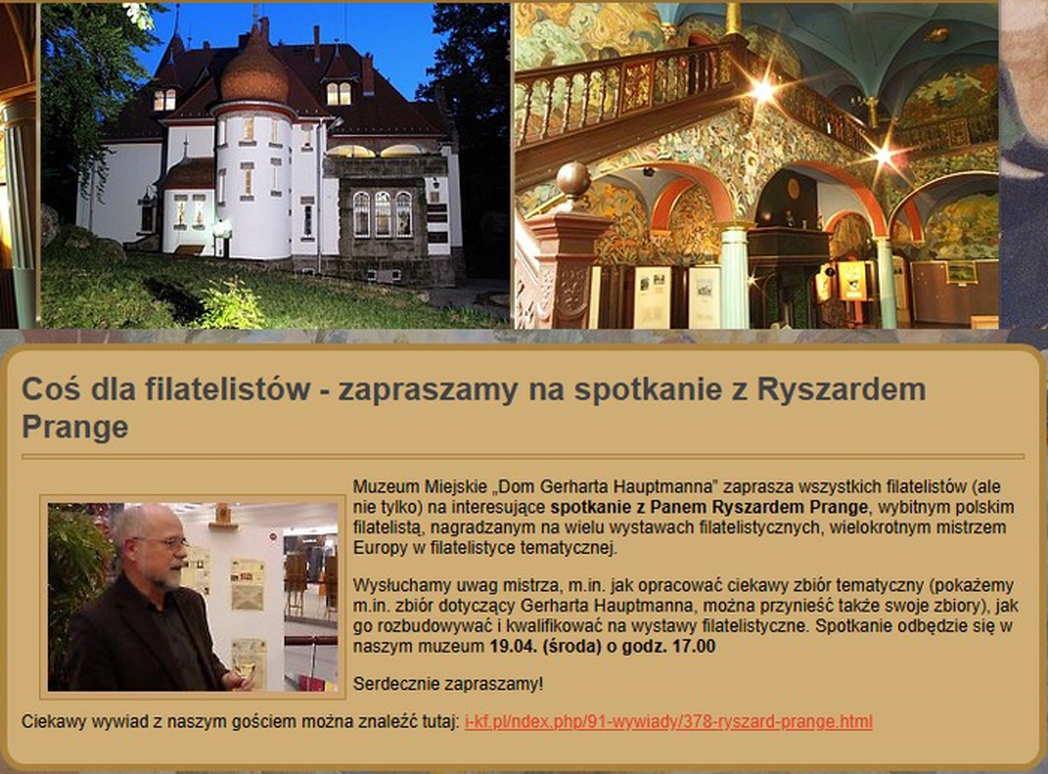 okreg wroclawskiKiedy Dyrektor Muzeum Miejskiego "Dom Gerharta Hauptmanna" w Jeleniej Górze-Jagniątkowie, Janusz Skowroński, dowiedział się, że Karkonosze odwiedza znany polski filatelista, ceniony tematyk i sędzia konkursowy PZF, Ryszard Prange, natychmiast wpadł na pomysł zorganizowania spotkania na terenie Muzeum. Pan Ryszard wyraził zgodę na zorganizowanie takiego spotkania, więc Dyrektor Muzeum skontaktował się z Kołem PZF nr 2 w Jeleniej Górze oraz Kołem PZF nr 63 w Zgorzelcu. W obu Kołach spotkał się z zainteresowaniem członków, więc szybko na stronie internetowej Muzeum ukazała się stosowna informacja/zaproszenie.